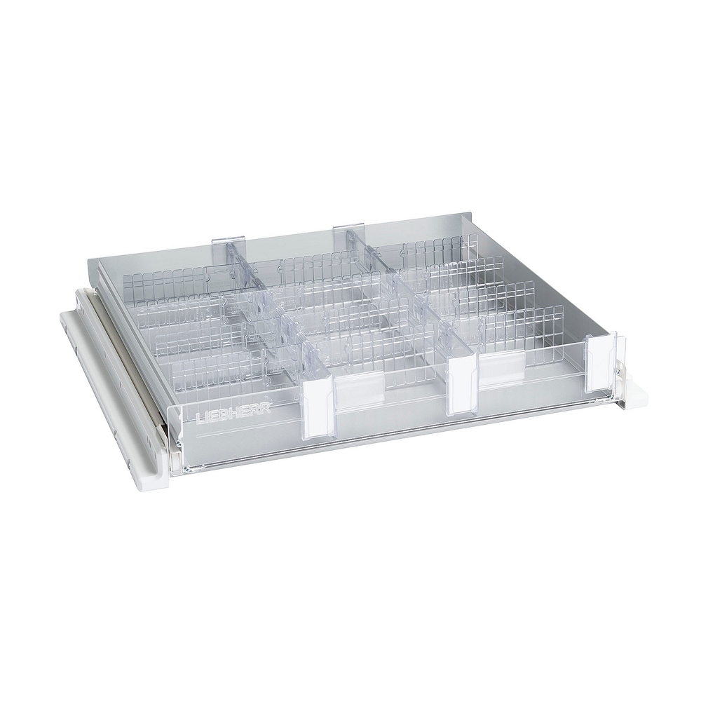 Équipé de séparateurs longitudinaux amovibles réglables sur toute la largeur du tiroir, et de curseurs plexi (sécables suivant la taille des compartiments désirés) avec logement pour étiquette d’identification.