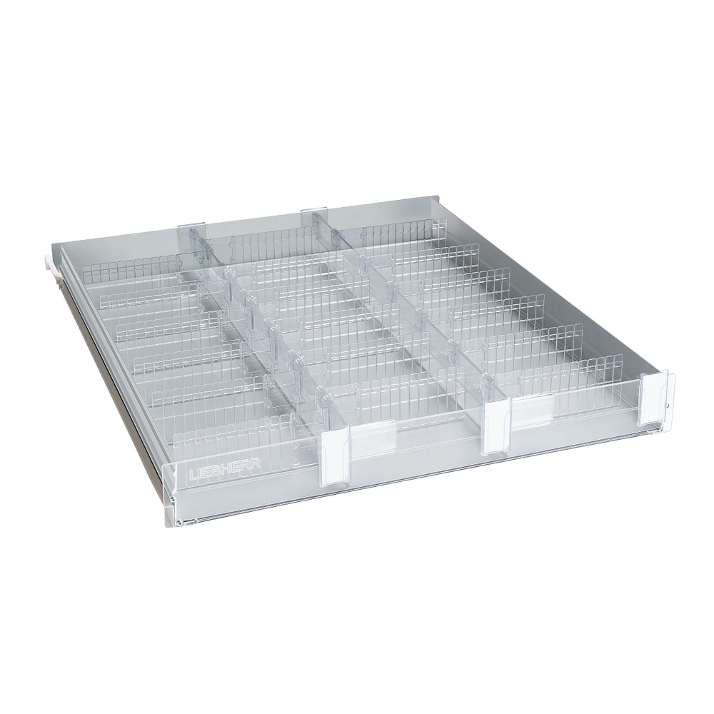 Équipé de séparateurs longitudinaux amovibles réglables sur toute la largeur du tiroir, et de curseurs plexi (sécables suivant la taille des compartiments désirés) avec logement pour étiquette d’identification.