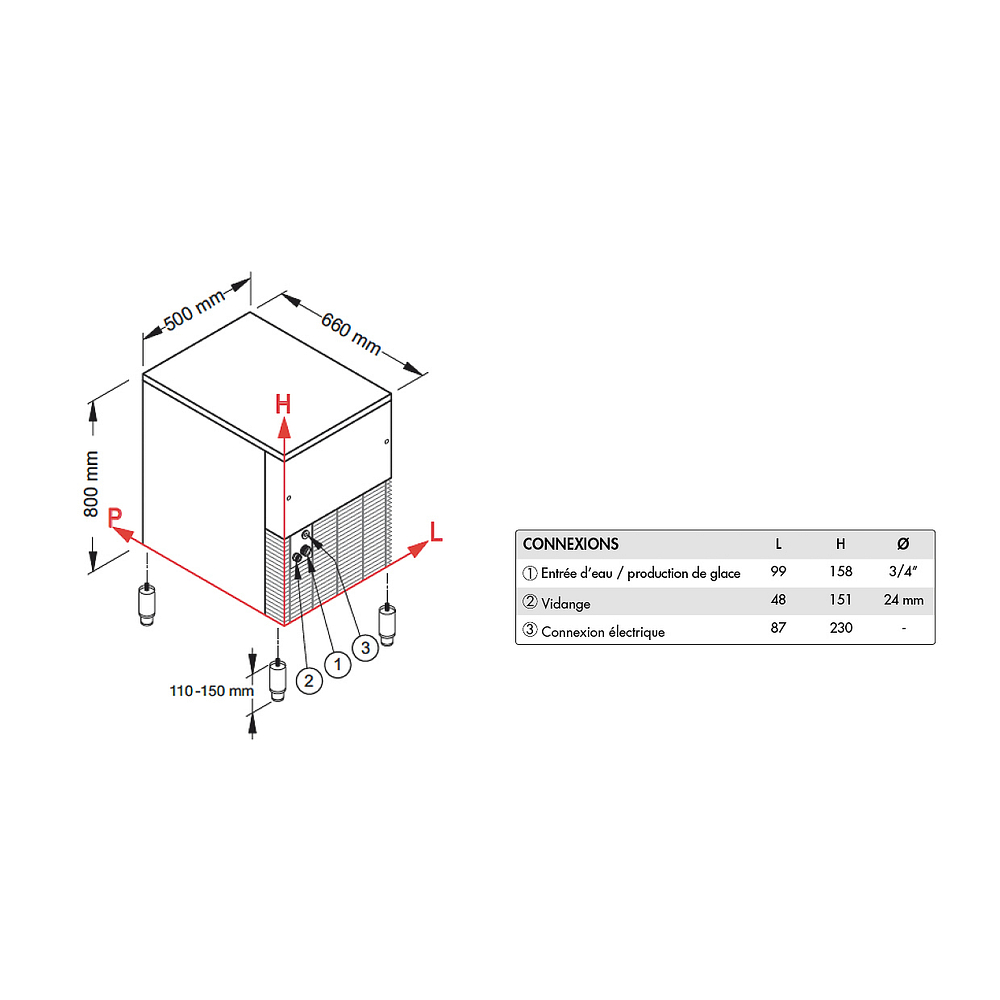 - Production à 21°C air / 15°C eau (kg/24h) 105
