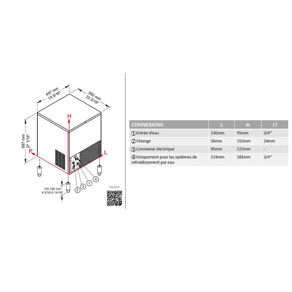 Livrées avec tuyau d’arrivée d’eau, d’évacuation et pelle à glace.